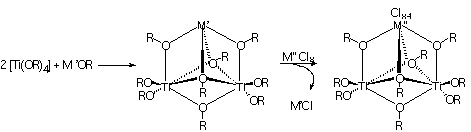 Com o objetivo de sintetizar modelos químicos funcionais da nitrogenase, temos interesse na preparação de agregados trinucleares do tipo [M'Ti2(OR)9] [1], onde M' = Na+ ou K+; R = OPri, que reajam com cloretos de ferro ou vanádio (M''Clx, x = 2 ou 3) produzindo alcóxidos heterobimetálicos do tipo [M''Cl(x-1)Ti2(OR)9], de acordo com a figura abaixo.