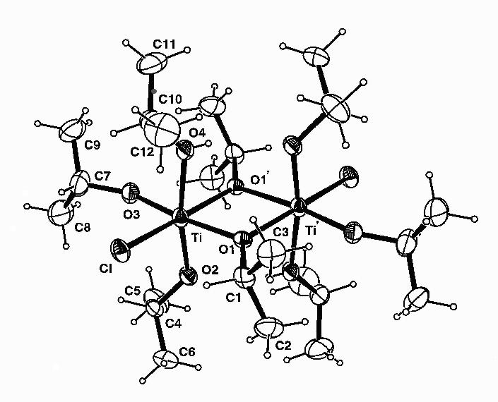 A análise dos teores de Ti e V indicou que o titânio era o único metal de transição presente no produto A. Nesta preparação foram isolados outros produtos cristalinos (verde e azul), ainda não caracterizados completamente, que provavelmente contêm vanádio. A análise por cristalografia de raios X do produto A revelou que a estrutura molecular consiste de centros de TiIV ligados em ponte por dois grupos isopropóxido. A cada átomo metálico estão ligados também dois isopropóxidos terminais, um cloreto e uma molécula de isopropanol, levando à fórmula estrutural [{TiCl(OPri)2(PriOH)}2(m-OPri)2] para o produto A. Nesta reação, o VCl3 aparentemente atuou como doador de cloretos para o alcóxido de titânio.