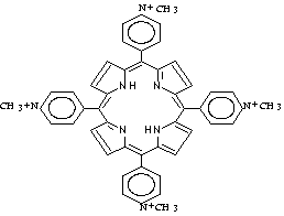 A melanina foi sintetizada a partir da oxidação da L-dopa frente a oxigênio do ar em meio básico favorecendo a conversão de hidroquinonas a quinonas e polimerização da L-dopa, seguindo o método proposto por Swan, et al., com algumas modificações [4]. O processo de síntese durou 72 horas e necessitou da adição de NH4OH para manter o pH em aproximadamente 8,2. A melanina formada foi precipitada com adição de ácido clorídrico 1 mol/L. O sólido foi lavado e centrifugado até que o pH do sobrenadante se encontrasse próximo de 7. O sólido foi então seco a pressão reduzida à 40 0C. A porfirina base livre TMPyP4+ (5,10,15,20- tetrakis (1-metil-4-piridil ) porfirina) (Figura abaixo) e seu respectivo ferrocomposto FeTMPyP5+ foram imobilizados na melanina através da interação da solução de melanina com as soluções de porfirina por tempo e temperaturas controladas sob agitação magnética. O processo de interação foi acompanhada por espectroscopia eletrônica. Foram utilizadas soluções de TMPyP4+ na concentração de 2,8 x 10-6 mol/L, solução de FeTMPyPCl5 na concentração de 6,9 x 10-5 mol/L e solução de melanina na concentração de 1,5 x 10-5 g/mL. Todas as soluções foram preparadas em tampão fosfato pH = 7,4. Esta baixa concentração foi necessária para evitar o encobrimento da banda Soret da porfirina pelas altas absorções da melanina. A solução de melanina foi adicionada à solução de porfirina ou ferroporfirina em pequenas quantidades ( 50, 100, 500, 1000, 2000, 3000 mL ), e registrados espectros para cada adição. Os dados foram analisados e comparados também por espectroscopia de RPE em solução e no caso da FeTMPyP5+, no estado sólido. Para a obtenção de sólido, a interação de melanina com metaloporfirinas consistiu na suspensão de melanina em solução de FeTMPyP5+. A mistura de reação foi mantida sob agitação por 2 horas e na sequência foi centrifugada sendo o sobrenadante retirado. O produto resultante foi lavado para se retirar toda metaloporfirina não interagida. O composto final, após secagem, foi analisado por RPE.