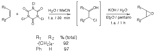 Não é conhecida a utilização de 1 em reações de coalogenação. Desta forma, dando continuidade aos nossos estudos de coalogenação de alquenos,3 estudou-se a cloração eletrofílica do ciclo-hexeno e do estireno com o ácido tricoroisocianúrico em presença de água, seguida da ciclização das cloroidrinas em meio básico.