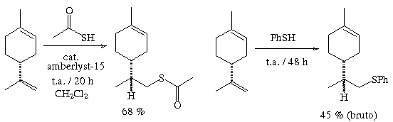 A reação de R(+)-limoneno em presença de amberlyst-15 com ácido tioacético levou a formação do tioéster na ligação dupla 8,9 em 68 % de rendimento e com orientação anti-Markovnikov. A adição de tiofenol originou a mesma quimio- e regiosseletividade e 45 % de rendimento bruto, porém neste caso a utilização do catalisador não mostrou nenhuma vantagem.