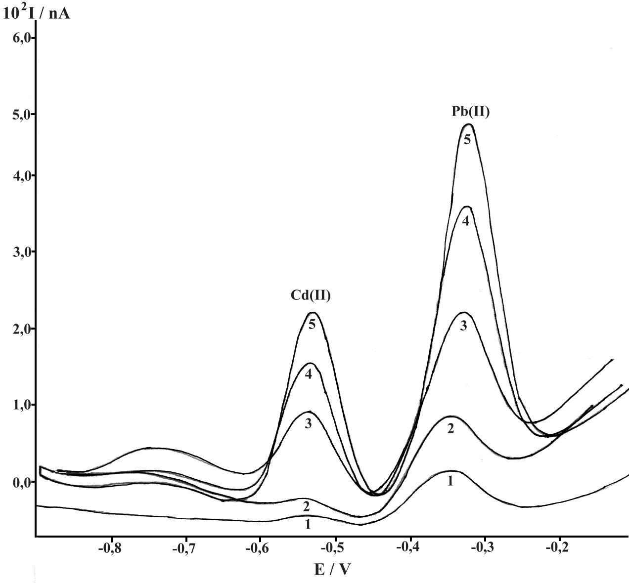 Figura 1 Voltamogramas obtidos para 1 ml de amostra de peixe digerida (curva 2). Curva 1 = branco; Curvas 3-5: adições sucessivas de 10 ml de Cd(II) 5 ppm e 10 ml de Pb(II) 10 ppm. |