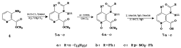 Para tanto, sintetizamos os ligantes 7a-c seguindo a rota sintética representada no Esq. 1. Assim como os produtos de interesse (7), os intermediários 5 e 6 foram então estudados por espectroscopia de 1H RMN e IV (em solução com CH2Cl2). Nestas estruturas, as interações entre o N-H11 e o substituinte carboxílico foram comparadas com as encontradas nas acetalinidas 1. A presença do grupo N-O nas estruturas 6 e 7, produzindo um sistema aromático 1,2,3-trisubstituído, resultou numa interação adicional influenciando a geometria molecular.