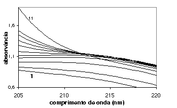 Medidas espectrofotométricas na região do ultra-violeta foram feitas em diferentes valores de pH. Os espectros 1 a 11 da Figura correspondem a soluções preparadas com o ácido histidinoidroxâ-mico, que tiveram o pH ajustado em 1: 7,63; 2: 8,34; 3: 9,62; 4: 9,40; 5: 9,95; 6: 10,51; 7: 10,75; 8: 10,91; 9: 11,08; 10: 11,36 e 11: 11,40. Os dados espectrofotométricos, a princípio, não se mostraram decisivos para a definição por um dos dois modelos. No entanto, na Figura verifica-se a presença de um ponto isosbéstico, em 212 nm, nos espectros correspondentes à faixa de pH entre 10,5-11,4. Tal fato se apresenta como um forte indício da existência de uma quarta desprotonação do ácido histidinoidroxâmico.