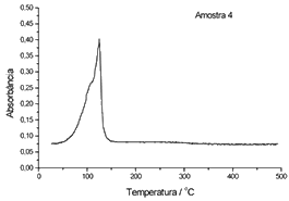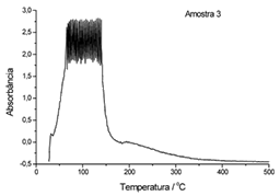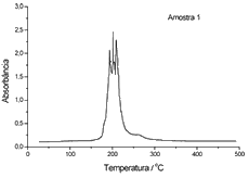 Em nenhuma das amostras in natura foi verificada presença de mercúrio. Já os perfis de dessorção do mercúrio nas mesmas apresentou diferenças. A comparação desses termogramas com termogramas de amostras padrão de mercúrio metálico, cloreto mercuroso e cloreto mercúrico permitem as seguintes observações: a amostra (1) apresentou uma oxidação imediata do mercúrio, logo após a preparação da mesma. O primeiro termograma já mostrou praticamente todo o mercúrio no estado de oxidação 2+. A amostra 3 apresentou oxidação do mercúrio de 0 para 2+ muito lenta. A amostra 4 mostrou uma oxidação do mercúrio de 0 para 1+, e muito lenta (semelhante a amostra 3) para 2+. A figura abaixo mostra termogramas obtidos das três amostras, logo após serem preparadas.