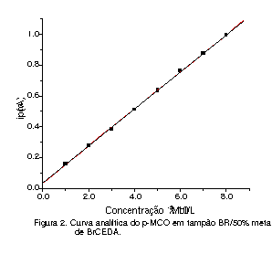 As curvas analíticas do p-MCO foram obtidas em tampão BR pH 4,0 com 50% de metanol e 0,03% do surfactante catiônico BrCEDMA, considerando que essas foram as melhores condições experimentais para determinação do p-MCO. Uma relação linear foi observada no intervalo de 0,5x10-5-8,0x10-5 mol/L , sendo ip(mA) = 0,03311 + 0,12056C(mol/L) e R= 0,9999 (fig.2). O limite de detecção foi de 3,0x10-6 mol/L. Essa metodologia foi aplicada na determinação do p-MCO em protetor solar de FPS 20 (7% de p-MCO) e 6 (4,5% de p-MCO) para as marcas N e 20 (7% de