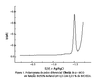 A redução polarográfica do p-MCO foi estudada em tampão B-R com 50% de metanol e surfactante catiônico BrCEDMA. A redução do composto apresentou apenas uma onda de redução em potenciais ao redor de -1,5 V (Ag/AgCl), bem próximo da descarga do eletrólito de suporte (fig.1). O estudo de pH, realizado no intervalo de 3,0-9,0, mostrou um deslocamento do potencial de pico para valores mais negativos com o aumento do pH. A corrente também varia, apresentando um valor máximo em pH 4,0. A influência da concentração do surfactante analisada entre 0,001-0,2%, revelou um deslocamento do potencial de pico para valores menos negativos com o aumento da concentração e a corrente pico aumentou até a concentração de 0,03%, a partir deste valor tornou-se constante.