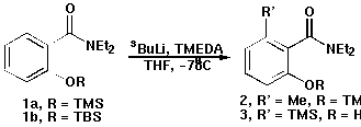 Rearranjos carbaniônicos aromáticos 1,3- O-Si ® C-Si são há muito conhecidos.1 No início da década de 80, Snieckus e col. investigaram novamente esta reação no contexto das litiações de N,N-alquil benzamidas.2 Observou-se que a metalação de 1a, seguida do tratamento com MeI, ocasionava, em vez do produto metilado 2, o produto de rearranjo do grupo trimetilsilila (TMS) 3. Experiências de reação cruzada evidenciaram a ocorrência de mecanismo intermolecular nesta migração de grupo silila extremamente rápida.3 A tentativa de provocar a mesma reação no substrato 1b, apresentando o substituinte tBuMe2SiO (TBSO), levou apenas a produtos de degradação.4