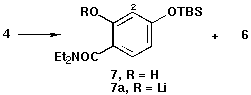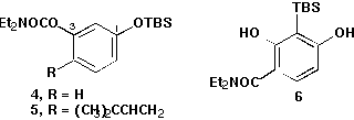 A reação do carbamato 4 com 0,9 eq. de sBuLi (-78oC - t.a.) levou somente à formação da benzamida 7, o que estabelece que o rearranjo o-Fries aniônico conhecido6 é anterior à migração do grupo silila. Note-se que este mostrou-se bastante resistente às condições requeridas (aumento de temperatura) pelo rearranjo do grupo carbamato. Aumentando a quantidade de base para 1,6 eq., observamos a formação da mistura de produtos 7 e 6 (43:57 respect.) em 84% de rendimento. Estes dois resultados demonstram que este rearranjo de grupo TBS inédito, ao contrário daqueles envolvendo substituintes OTMS ou OTES, é controlado, de modo que possibilita outras intervenções estruturais antes de sua ocorrência. No momento, estudamos condições que provoquem a conversão integral 4®6.