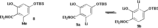 A regioquímica da migração de TBS para C-2, após a metalação subsequente da fenóxido benzamida intermediária 7a, é intrigante já que não é C-2 a posição orto ao grupo diretor de o-metalação (DoM) mais potente, neste caso, a dietilamida. Em uma última experiência, geramos este intermediário 7a e o submetemos à condição típica de desprotonação, para depois tratá-lo com MeI. O produto obtido -ainda sob caracterização- parece ser o produto 8, o que respeita a expectativa de regiosseletividade baseada na habilidade dos grupos DoM presentes. Parece haver, portanto, um equilíbrio entre espécies aril lítio 9a e 9b anterior à migração de TBS observada.