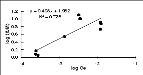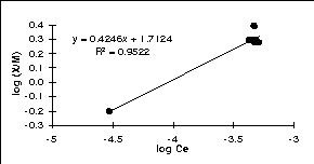 onde K e Kf são os coeficientes de adsorção (sendo Kf o coeficiente de Freundlich), n é o índice da intensidade da adsorção que depende da substância adsorvida e do meio adsorvente. Kf e n são parâmetros de regressão característicos para cada sistema solo-herbicida. Os valores de Ce e X/M são determinados por hplc empregando-se diferentes concentrações iniciais de herbicida. A partir dos valores obtidos da adsorção do herbicida 2,4-D no solo, foram obtidos os gráficos de isotermas de Freundlich (apresentados nas figuras 1-4) e os parâmetros K, Kf e n.