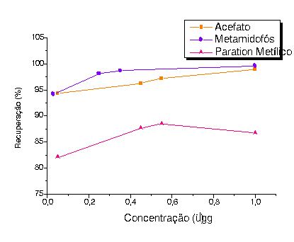 Neste trabalho foram feitos estudos de recuperação dos organofosforados, metamidofós, paration metílico e acefato para testar a eficiência do método em relação à concentração de fortificação da amostra de tomate.