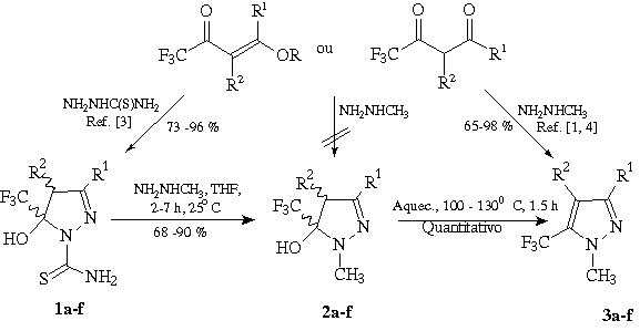 Nós publicamos recentemente que b-alcoxiviniltrifluormetil Cetonas reagem com tiosemicarbazidas para dar alquil[aril]-substituídos-5-hidróxi-5-trifluormetil-4,5-dihidro-1H-pirazoltiocarboxiamidas (1a-f) com excelente rendimentos3. Compostos 1a-f reagem facilmente com metilhidrazina em uma pequena quantidade de tetrahidrofurano a 250C durante 2 a 7 horas, dando com bons rendimentos 4,5-diihdro-1H-1-metilpirazol (2a-f) e tiosemicarbazida, como subproduto. As pirazolinas 2a-f foram quantitativamente desidratadas aquecendo 250C acima do ponto de fusão durante 1,5 horas dando o correspondendo aromático 1H-1-metilpirazol 3a-f.