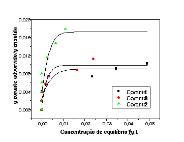 Independente da classe dos corantes testados, as porcentagens de massa de corante adsorvida foram superiores a 50%. Em concentrações iniciais de corante menores que 0,04 g.L-1, a remoção foi superior a 90%. Todas as isotermas demonstram uma alta afinidade entre os corantes e a crisotila. Observa-se um comportamento típico de sistema particulado, ou seja, existe uma região característica de saturação da superfície da crisotila. Isto ocorre na região do gráfico onde a relação massa adsorvida/massa crisotila permanece constante.