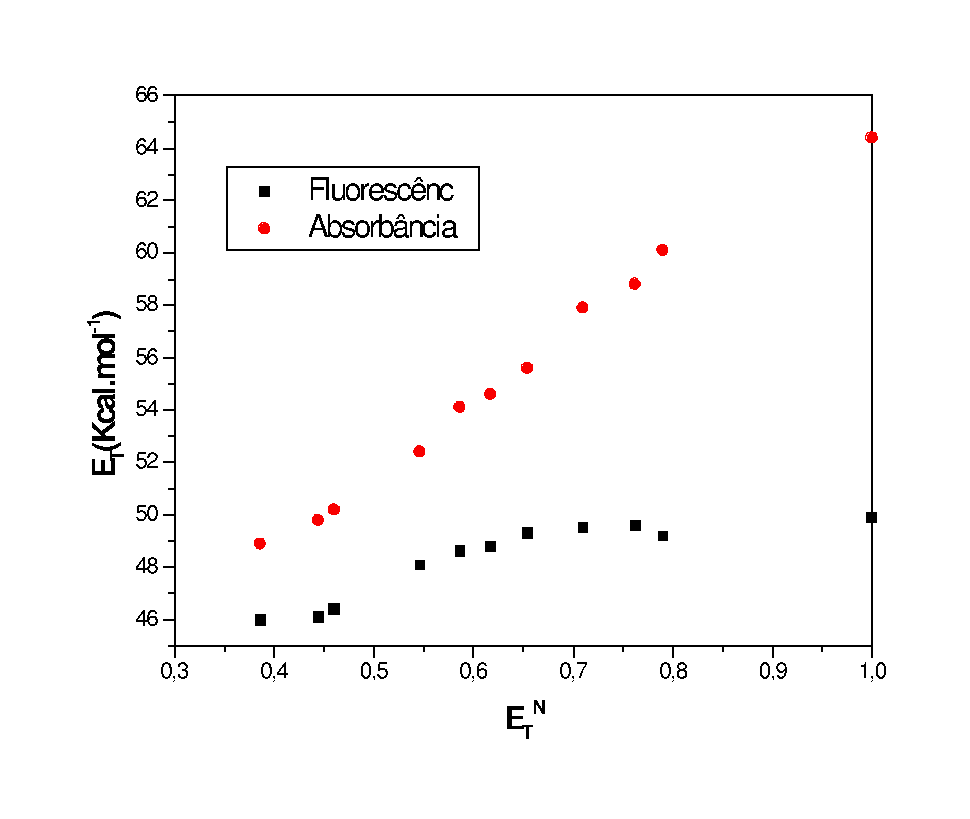 A Figura 1 apresenta os valores das energias de transição eletrônica (ET) calculadas a partir dos máximos de absorção e emissão (ET= 28590/lmáx.) para o corante 3 em função da polaridade (ETN) dos solventes empregados. Observa-se que o efeito do solvente é menor na fluorescência que na absorção eletrônica.