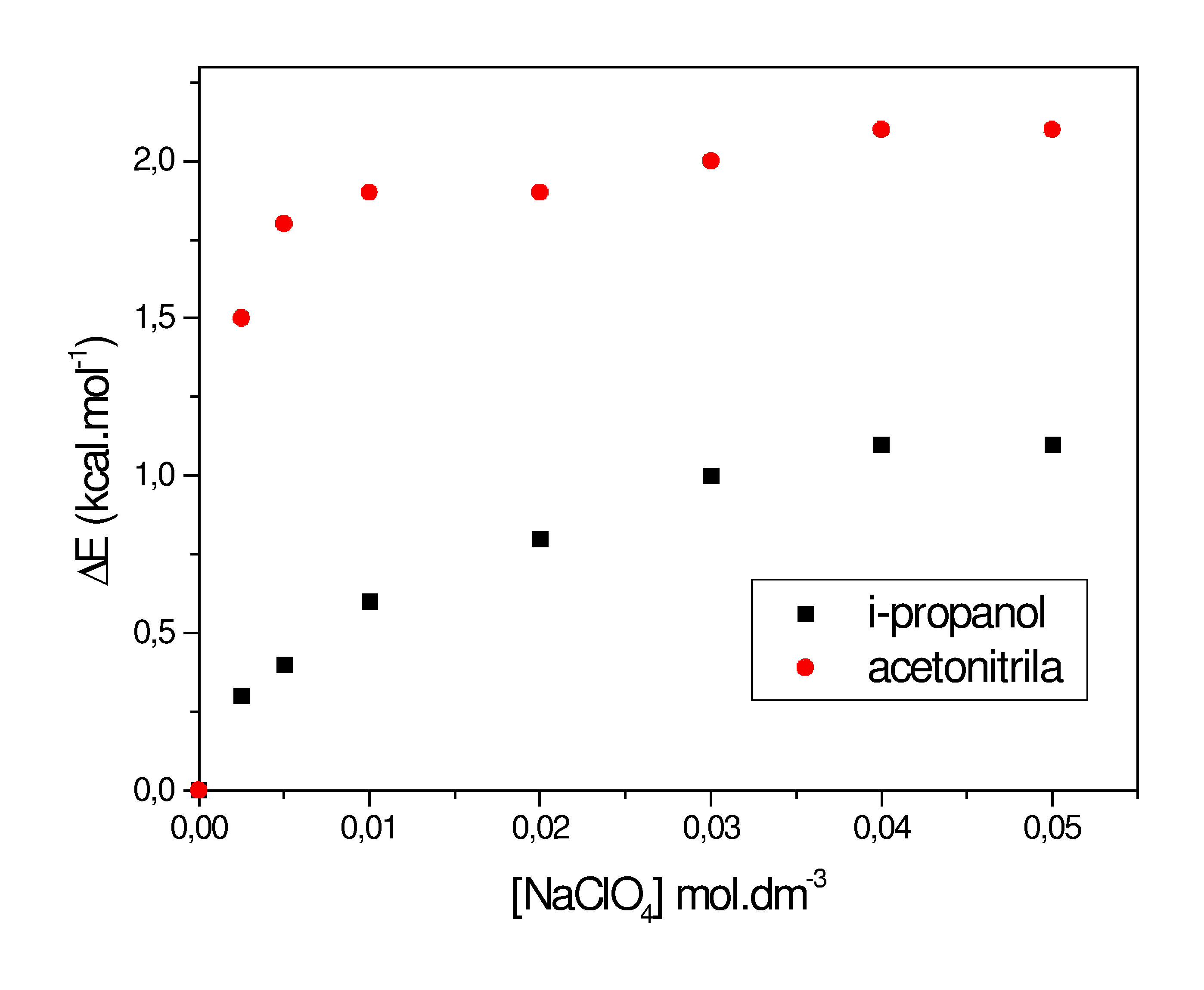O espectro de emissão de fluorescência do corante 3 também foi registrado para soluções com concentrações crescentes de eletrólitos. A Figura 2 apresenta a variação de energia para a transição eletrônica na presença e ausência de sal (DE) em função da concentração de NaClO4. O comportamento observado em i-propanol e acetonitrila é similar aos valores obtidos com outros pares solvente/sal empregados. Quando o sal é adicionado ao meio, constituído do solvente e do corante, a associação entre o cátion solvatado e a unidade fenólica do composto 3 é quem determina as mudanças halocrômicas em solução e consequentemente as variações nos espectros de fluorescência.