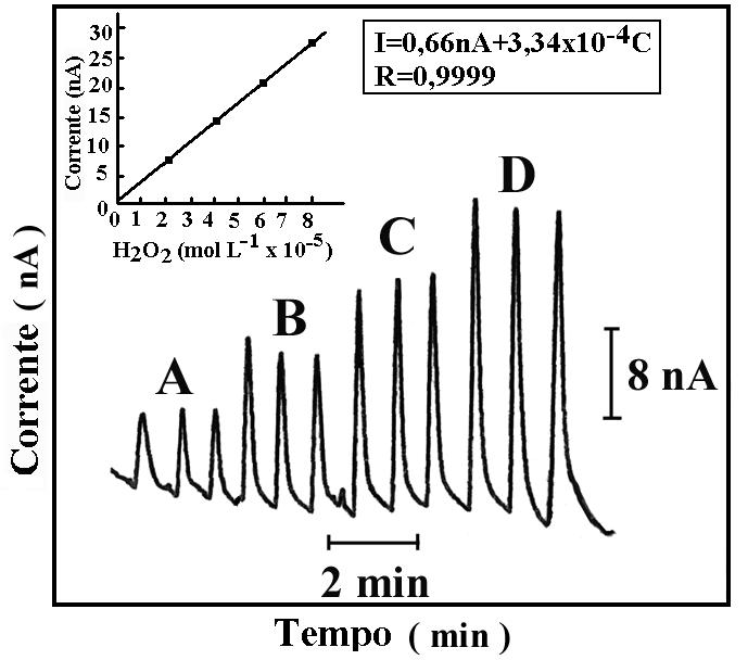 Para a determinação de H2O2 foram realizadas análises FIA com detecção amperométrica a potencial constante. A Figura 2 mostra a variação linear dos sinais obtidos, variando-se a concentração de H2O2 entre 2 x 10-5 (A) e 8 x 10-5 mol L-1 (D). O limite de detecção é da ordem de 1 x 10-6 mol L-1.