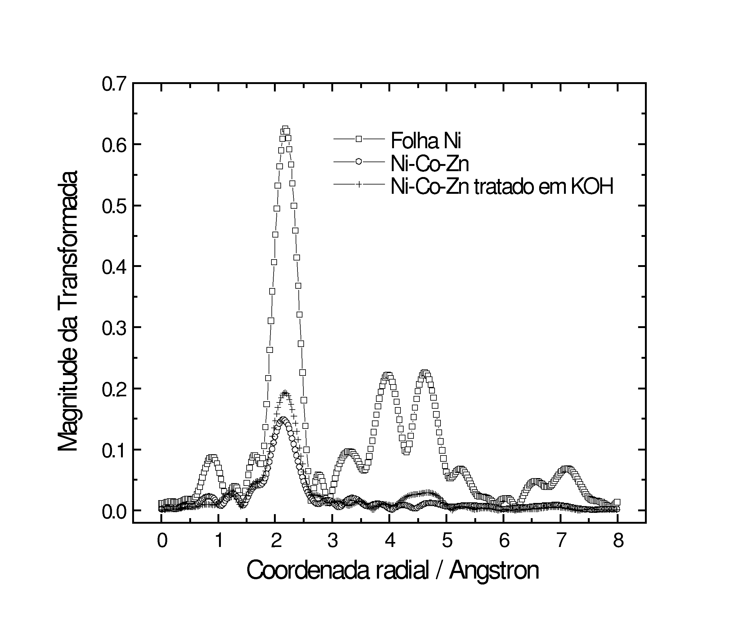 Na Figura 1 apresenta-se a transformada de Fourier do sinal EXAFS obtido na borda K do Ni para a liga Ni-Co-Zn, antes e após tratamento químico em KOH para a remoção parcial do Zn. Nota-se que, as características morfológicas da liga é completamente distinta da do Ni metálico, tratando-se provavelmente de um material com características amorfas. Análises efetuadas na borda K do Co confirmaram estes resultados. Nos demais casos, os materiais apresentaram características similares à do Ni metálico, indicando uma cristalização do tipo cúbica de face