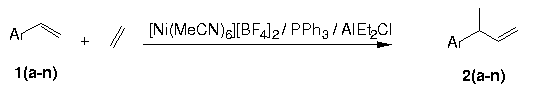 A codimerização de olefinas com etileno, também chamada de hidrovinilação de olefinas, pode ocorrer com elevadas quimio- e regiosseletividades e sob condições amenas, quando conduzida na presença metais de transição e ligantes apropriados. No caso da hidrovinilação de derivados do estireno, os produtos desejados são os 3-aril-1-butenos. Essas olefinas são facilmente oxidadas a ácidos 2-arilpropiônicos, que são largamente utilizados como antiinflamatórios não estereoidais, tais como Ibuprofeno, Naproxeno e Ketoprofeno. Além disso, o (R)-3-fenil-1-buteno pode ser usado como monômero para homopolimerização ou copolimerização de olefinas, fornecendo polímeros com alta regularidade e boas propriedades físicas e mecânicas. Em trabalhos anteriores, nós aplicamos o sistema catalítico [Ni(MeCN)6][BF4]2 / AlEt2Cl / PPh3 para a reação de hidrovinilação de ariletilenos1. Nas condições estudadas somente o estireno e alquilestirenos conduziram a um sistema ativo e seletivo. No presente trabalho procurou-se estudar a reação de hidrovinilação catalítica de diversos substratos ariletilenos, visando encontrar as condições reacionais mais adequadas para a obtenção quimio- e regiosseletiva de produtos 3-aril-1-buteno, independente dos grupos ligados ao anel aromático.