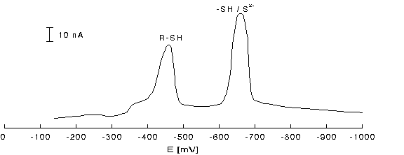 O mecanismo de formação de sulfetos a partir das soluções de NP não está ainda perfeitamente estabelecido; contudo, espécies voláteis como sulfeto livre e algumas formas sulfetos combinados de baixo peso molecular, são freqüentes em soluções NP, mesmo dentro de seus prazos de validade. Espécies como metanotiol e etanotiol, que apresentam grupo sulfidrila, comportam-se de maneira idêntica em relação ao eletrodo de mercúrio e podem ser quantificadas como sulfeto combinado sem distinção entre uma forma e outra. A figura abaixo mostra o perfil dos sinais voltamétricos obtidos na presença de sulfeto livre e combinado nas condições descritas.