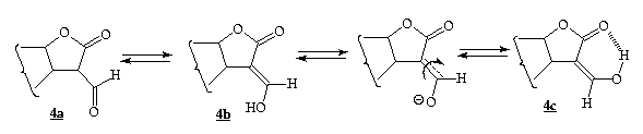 Para obtenção de dados que corroborassem com as observações anteriormente descritas, foi realizado um estudo de modelagem molecular para o intermediário 4, na forma aldeídica 4a e na forma enólica 4b e 4c, usando o pacote MOPAC 150, fazendo-se uso do Halmitoniano PM3 por ser melhor parametrizado para estudos de ligação hidrogênio e a palavra chave EF HESS como fator de acurácia.