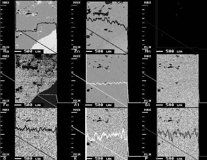 1 - Mapas químicos de O, Al, Si, Fe, Na, Zn, Mn, P, Ca e. São