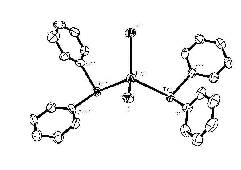 A cela unitária contém 4 moléculas do [Hg(Ph2Te)2I2], sendo que a molécula total é gerada através da unidade assimétrica pela operação de simetria x+1,y, -z+0,5. O íon Hg(II) apresenta coordenação tetraédrica com dois átomos de iodo (dist. Hg-I= 2.7659(8)Å) e dois ligantes difeniltelúrio(dist. Hg-Te=2.8999(8)Å). Os ângulos entre os ligantes situam-se entre 103,63(2)° a 117,62(4)°.