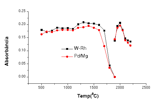 Modificador químico permanente constituído de tungstênio-ródio (250 µg W + 200µg Rh) foi empregado para estabilização térmica do analito e aumento do tempo de vida útil do atomizador (3). Foi empregado um espectrômetro de absorção atômica Perkin Elmer modelo 4100 ZL equipado com THGA e corretor de absorção de fundo pelo efeito Zeeman longitudinal. O programa de aquecimento utilizado foi: (rampa; patamar) secagem 130°C (2 s; 20s) e 160°C (15s; 20s), pirólise 1200°C (20 s; 10 s), atomização 20500C (0s; 5s) e limpeza 2200°C (1s; 4s).