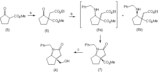 A primeira etapa na obtenção do composto objetivo (4), consistiu na C-alquilação regiosseletiva da 2-carbometoxiciclopentanona (5), empregando bromoacetato de etila e carbonato de potássio em acetona a t.a. por 24h3, fornecendo o diéster (6) em 87% de rendimento. O derivado (6) foi então submetido a condições de aminação redutiva empregando acetato de benzilamônio e cianoboroidreto de sódio em metanol sob refluxo4 gerando 2-benzilamino-1-etiloxicarbonilmetil-1-ciclopentanocarboxilato de metila que após ciclização in situ e separação cromatográfica forneceu a g-lactama (7) em 56% de rendimento, além do derivado cis-2-benzilamino-1-etiloxicarbonilmetil-1-ciclopentanocarboxilato de metila (8b) em 13% de rendimento. A análise da proporção relativa do derivado (7) e a ciclopentanamina (8b), i.e. 4,3:1, respectivamente, sugere que o processo de aminação redutiva seja diastereosseletivo. A etapa final da rota sintética consistiu na redução quimiosseletiva do grupamento éster utilizando boroidreto de sódio sob refluxo de isobutanol por 2h5, fornecendo o derivado (4) em 85% de rendimento.