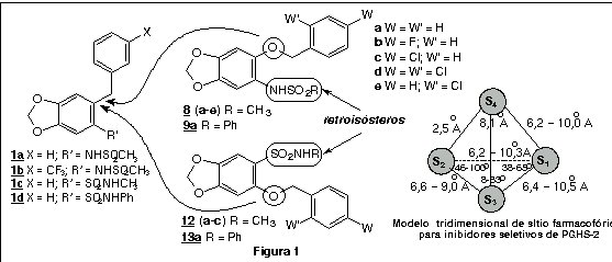 Dentro de uma linha de pesquisas que visa o planejamento, a síntese e a avaliação farmacológica de novas substâncias moduladoras das enzimas da cascata do ácido araquidônico, descrevemos nesta comunicação, a síntese de dez novos derivados 8 (a-e), 9a, 12 (a-c) e 13a, sintetizados a partir do safrol 2 e racionalmente planejados a partir dos protótipos 1 (a-d), previamente sintetizados no LASSBio por Lages e colaboradores2 (Figura 1) como inibidores seletivos de PGHS-2. Os novos derivados 8 (a-e), 9a, 12 (a-c) e 13a se caracterizam estruturalmente pela inserção de um átomo de oxigênio na unidade metilênica espaçadora dos análogos 1 (a-d) de forma a permitir interações hidrofóbicas adicionais com a Tyr-385 (S3), presente no sítio ativo da PGHS-2, conforme modelo tridimensional desenvolvido no LASSBio3 (Figura 1).