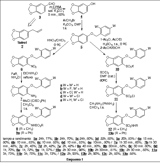 A rota sintética empregada (Esquema 1), explorou na etapa chave a oxidação de Baeyer- Villiger4 sobre o piperonal 3, oriundo do safrol 25, e posterior hidrólise in situ, do aduto formado ao derivado fenólico 4, em 85% de rendimento. Este composto foi convertido nos compostos finais desejados 8 (a-e), 9a e 12 (a-c), 13a, em 4 e 7 etapas consecutivas, respectivamente. Os compostos finais 8 (a-d), 9a, 12a e 13a foram eleitos para avaliação de suas propriedades anti-inflamatórias no ensaio de edema de pata de rato induzido por carragenina, nas concentrações de 100 e 300 mmol.