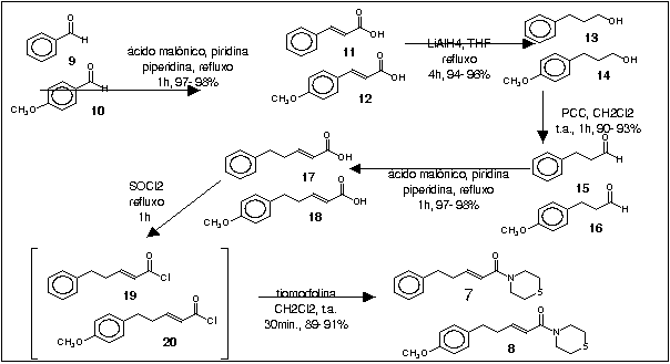 A Figura 3 ilustra a rota sintética empregada para a obtenção dos novos compostos morfolínicos (7 e 8) preparados com ótimos rendimentos globais, onde variou-se o padrão de oxigenação do anel benzênico em relação ao protótipo (6), mantendo-se sua natureza amídica conforme indicaram os estudos de modelagem molecular.
