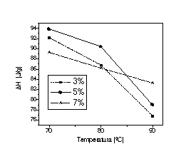 O estudo da variação da entalpia de fusão por DSC (figura 01) mostrou que, com o aumento da temperatura de reticulação, a entalpia de fusão diminui, indicativo de diminuição na cristalinidade. A diminuição é mais acentuada em 3 e 5% e acima de 80ºC. Deste modo, a temperatura exerce maior influência nesta propriedade a 3 e 5% de catalisador do que em 7%. Na figura 02 são mostrados as curvas de DSC convencional e pela técnica SSA para uma das amostras do planejamento fatorial. Como pode ser visualizado, na técnica SSA, a curva apresenta múltiplos picos de fusão, os quais representam faixas de espessura lamelar presentes no material. O estudo comparativo das curvas de DSC pela técnica SSA das amostras nas diversas condições de experimento indicou significativas diferenças na intensidade e distribuição dos picos de fusão nas amostras não extraídas e também nas fases gel e sol.