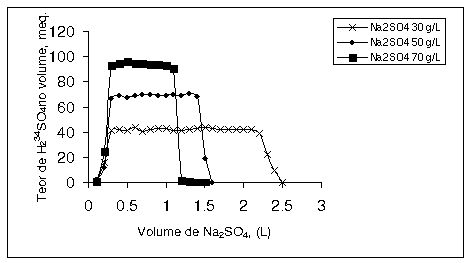 Nos volumes de H234SO4 produzido foram determinados a concentração de sódio (mg L-1 de Na) para se verificar o instante em que ocorria a mistura entre ácido sulfúrico e sulfato de sódio no efluente. Os pontos de inflexão das curvas da Figura 1 mostram que aos 2,2; 1,4 e 1,1 litros o Na+ é dectado para a concentração de 30, 50 e 70 g L-1 de Na234SO4, respectivamente. No entanto, para estas mesmas concentrações, verificou-se a viabilidade da utilização de 2,5; 1,6 e 1,2 litros de solução eluída onde a concentração de Na+ foi relativamente baixo.