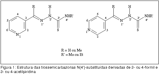 As tiossemicarbazonas e seus complexos metálicos são uma classe de compostos que apresentam uma grande diversidade de aplicações biológicas(1). Sabe-se que a atividade biológica das tiossemicarbazonas varia com a presença de subtituintes no nitrogênio terminal. Em muitos casos, a presença do substituinte faz aumentar a atividade biológica desses compostos(2). Nesse trabalho realizamos a síntese de complexos de níquel(II) de N(4)-metil e N(4)-etil tiossemicarbazonas derivadas de 3- e 4-formilpiridina (H3Fo4M, H3Fo4E, H4Fo4M, H4Fo4E) e 3- e 4-acetilpiridina (H3Ac4M, H3Ac4E, H4Ac4M, H4Ac4E, FIG.1).