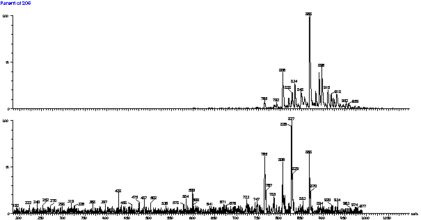 Figura 1. Espectro de "íons pais" do íon m/z 206 obtidos para A. Decussatum (A) e H. Volubilis (B). O alcaloóide principal detectado (m/z 868) foi identificado como wilforina.