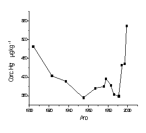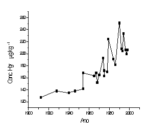 As Figuras 1 e 2 mostram a distribuição histórica de mercúrio dos testemunhos de sedimento dos Lagos Araçá e Nazaré. As velocidades de sedimentação obtidas pelo modelo CRS (não mostradas neste resumo) apontam para uma maior velocidade em períodos mais recentes, coincidentes com concentrações maiores de mercúrio total nos sedimentos.