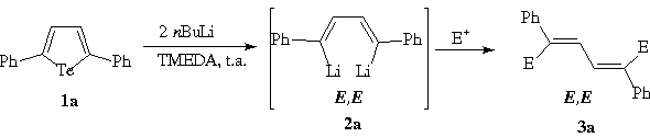 Uma das aplicações de telurofenos, a exemplo do que ocorre com os teluretos vinílicos não aromáticos, é a troca Te/Li com n-BuLi. Aqui, há a formação do intermediário 1,4-dilitiado 2a, que pode então ser capturado com vários eletrófilos, levando ao dieno dissubstituído correspondente de configuração E,E, 3a, com retenção de configuração1 (Equação 1).