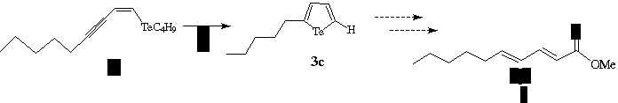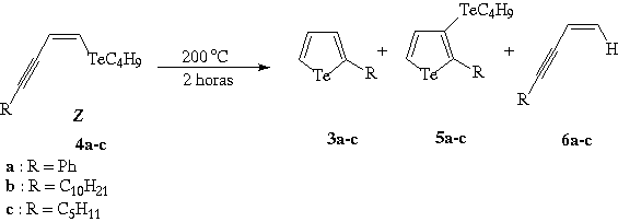 Nos exemplos testados até o momento, observou-se, além da formação do telurofeno 3 esperado (23 - 42%), a presença do butenoíno detelurado 6 (11 - 33%), além do telurofeno dissubstituído 5 (10 - 24%). A presença destas espécies foi determinada pela análise dos espectros de RMN 1H e de massas. No momento estamos efetuando um estudo das melhores condições de tempo e temperatura, com o objetivo de melhorar o rendimento e dirigir o curso da reação no sentido de formação do telurofeno 3.