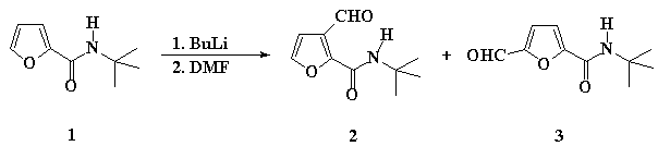 Ao longo do processo sintético, foi necessário obter o aldeído 2. Sua obtenção foi planejada a partir da amida 1 através de uma reação de metalação orto-dirigida, seguida de formilação do diânion gerado pela adição de dimetilformamida (DMF). Neste processo espera-se obter, além do aldeído 2, o produto de abstração do hidrogênio localizado na posição a ao oxigênio do anel furânico, que após formilação gerará o aldeído 3. As proporções relativas entre estes aldeídos isoméricos dependerão das condições do meio reacional.