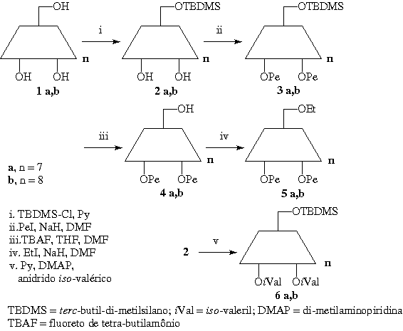 Neste projeto sintetizamos novas fases quirais seletivamente alquiladas e/ou aciladas a partir das b- e g-ciclodextrinas nativas (1 a,b). As fases 6-O-etil-2,3-di-O-pentil-b-ciclodextina (5a), 6-O-etil-2,3-di-O-pentil-g-ciclodextina (5b), 2,3-di-O-iso-valeril-6-O-TBDMS-b-ciclodextina (6a) e 2,3-di-O-iso-valeril-6-O-TBDMS-g-ciclodextina (6b) foram sintetizadas por métodos já descritos na literatura.