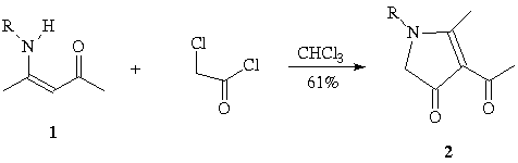 Neste trabalho descrevemos a reação das enamino cetonas (1) frente a 1,2-dieletrófilo (cloreto de cloro acetila), que fornece 4-pirrolin-3-ona (2) onde o fragmento enamino cetona está incorporado ao anel, (Esquema 1).