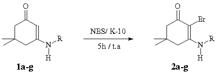 Em trabalhos anteriores descrevemos a reação das 5,5-dimetil-1,3-cicloexanodiona (1a-e)5 com NBS/K-10/MeOH/t.a. Neste trabalho aplicamos esta metodologia para os compostos 1f-g obtendo-se regioseletivamente os produtos de substituição na posição vinílica 2f-g (Esquema 1).