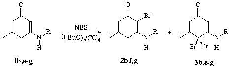 A bromação das enamino cetonas 1b,e-g utilizando N-bromosuccinimida (NBS), peróxido de t-butila/CCl4/refluxo como condição reacional, forneceu uma mistura de enamino cetonas monobromadas na posição vinílica (a-carbonila) e dibromadas na posição alílica com exceção do composto 1e onde isolou-se somente o produto dibromado 3e com rendimento de 62% (Esquema 2).