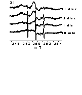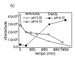 De modo geral, observa-se uma acentuada redução na intensidade das linhas finas em funcão do tempo (figura 1b). Adicionalmente, há o aparecimento de bandas alargadas sobrepostas as linhas finas. Geralmente, o alargamento dessas bandas está associada com a diminuição da mobilidade das moléculas contendo o marcador de spin. Esses resultados indicam que 5-SASL migrou para o interior da molécula do AH. Para valores de pH maiores que 5, não foi observada o alargamento das bandas. Esse fato indica que as variações estruturais do AH, moduladas pelo pH (4), determinam diretamente a existência de regiões ou sítios hidrofóbicos.