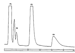 A solução eletrolisada e analisada por HPLC apresentou 4 picos principais como mostram os cromatogramas na Fig.2, antes (A) e após (B) a eletrólise. P1 (tR=2,5min) é atribuído ao LiClO4 remanescente da fase de extração, e P2 (tR=4,1 e 5,1); P3 (tR=11,3) e P4 (tR=20,7min), monitorados em 260nm, aos produtos de oxidação do DIP. Os espectros de UV-Vis das 3 amostras coletadas, P2,P3 e P4, mostram apenas ombros em 530nm, 460nm e 260nm, sendo que a absorção em 260nm é cerca de 30 vezes maior que a absorção no visível. Espectros de RMN, estão sendo analisados e novas preparações estão em andamento para obtenção de quantidades maiores dos produtos da eletrólise.
