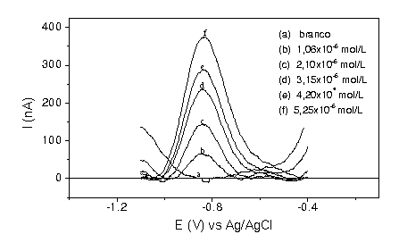 Figura 1  Voltamogramas de onda quadrada obtidos para diferentes concentrações do pentaclorofenol em tampão fosfato (n = 100 Hz; a = 50 mV e DE = 2mV).