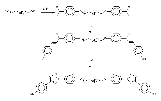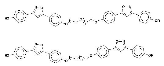 Em adição aos tradicionais estudos da relação estrutura/comportamento mesomórfico em Cristais Líquidos Termotrópicos, descreve-se a síntese e comportamento mosomórfico de moléculas não lineares que incorporam em sua estrutura unidades mesogênicas do tipo bananas. A introdução de heterocíclos pentagonais tem por objetivos alterar a linearidade molecular, mudar a polarizabilidade da molécula pela presença de heteroátomos e fornecer dipolos permanentes. O equilibro desses efeitos em conjunto com os disturbos térmicos, são fatores determinantes na formação e estabilização das mesofases. Avaliar esses fatores; determinar como o desvio da linearidade compromete as propriedades mesomórficas e entender qual é a influência dos heteroátomos nos sistemas mesogênicos, fazem parte dos objetivos desse trabalho. Para tanto, descreve-se a síntese de bismesógenos, que incorporam em suas unidades centrais rígidas estruturas tipo bananas, contendo o anel isoxazol 3,5-diaril substituídos conectados a espaçadores flexíveis metilênico ou poliéter (figura 1).