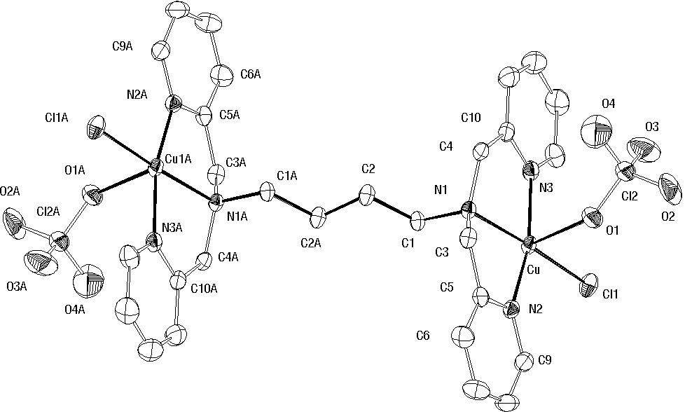 O Complexo Cu2C28N6H32Cl4O8 foi sintetizado a partir da reação do ligante TBPN (N,N,N,N-tetrakis(2-piridilmetil)1,4-butanodiamina) em metanol com CuCl2 (1:2) , ocorrendo a formação, rapidamente, de um composto de coordenação com coloração azul intensa após adição de perclorato de potássio. O composto foi recristalizado em etanol a 95%.
