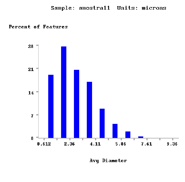 Através das fotomicrografias de MEV observa-se que a sílica preparada de microemulsão possui forma esférica Fig.1, utilizando-se o programa computacional Image Craft em conjunto com esta técnica determinou-se através do histograma percentual Fig.2, a distribuição de tamanho de partículas entre 0.61 a 9,36 mm, sendo a moda (família ou conjunto de famílias mais populosa, ou seja a maior freqüência ) 1,68 a 2,10 mm , o tamanho médio de partícula 2,74 mm e a razão do aspecto 1,17 (parâmetro, igual a 1 para uma esfera perfeita). Com as análises de BET determinou-se a área superficial do material obtido, o diâmetro médio e o volume dos poros da sílica que são respectivamente 906 m2/g, 30 A e 0,38 cm3/g. Os espectros de luminescência excitados a 370 nm apresentam uma banda de emissão com máximo em torno de 590 nm referente as formas iônicas, e uma outra banda menos intensa por volta de 450 nm correspondente a forma lactônica da rodamina.